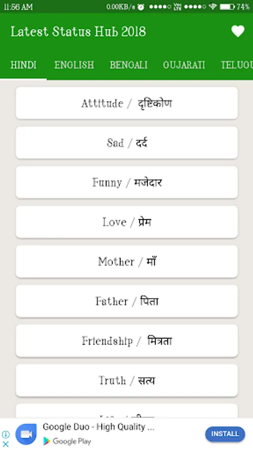 इस एप्लिकेशन में हिंदी, गुजराती, अंग्रेजी, मराठी, पंजाबी, तमिल, तेलुगु, कन्नड़, बंगाली जैसी विभिन्न भाषाओं में स्टेटस संदेश शामिल है।