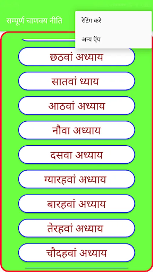 यह ऐप आपको शंककट में आसान और प्रभावी तरीके से चाणक्य निती पढ़ने का सबसे अच्छा विकल्प लाता है। चाणक्यता हिंदी हिंदी के लिए उद्धरण आवेदन आधुनिक इंटरफेस के अनुसार डिजाइन किया गया है जिसमें चाणक्य के नीती-सूत्रों ने लोगों को बताया कि उन्हें अपने जीवन से संबंधित विभिन्न चीजों के साथ व्यवहार और जागरूक होना चाहिए। इस आवेदन के साथ, आप चाणक्य के जीवन के इतिहास को जान सकते हैं जो आपको वह महान व्यक्तित्व बताएगा और जीवन के बारे में अच्छे उद्धरण जो वह साझा करता था। इस एप्लिकेशन में बहुत से अध्याय हैं जिनमें आप उद्धरण अध्याय के अनुसार देख सकते हैं जो आपको दैनिक प्रेरणादायक उद्धरण के साथ-साथ जीवन के बारे में प्रसिद्ध उद्धरण भी देगा। चाणक्यती के कुछ सबसे लोकप्रिय उद्धरणों में से कुछ इस ऐप में शामिल हैं।