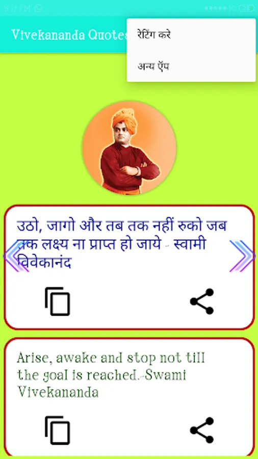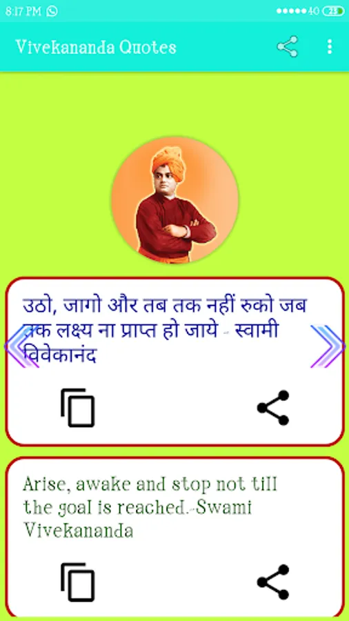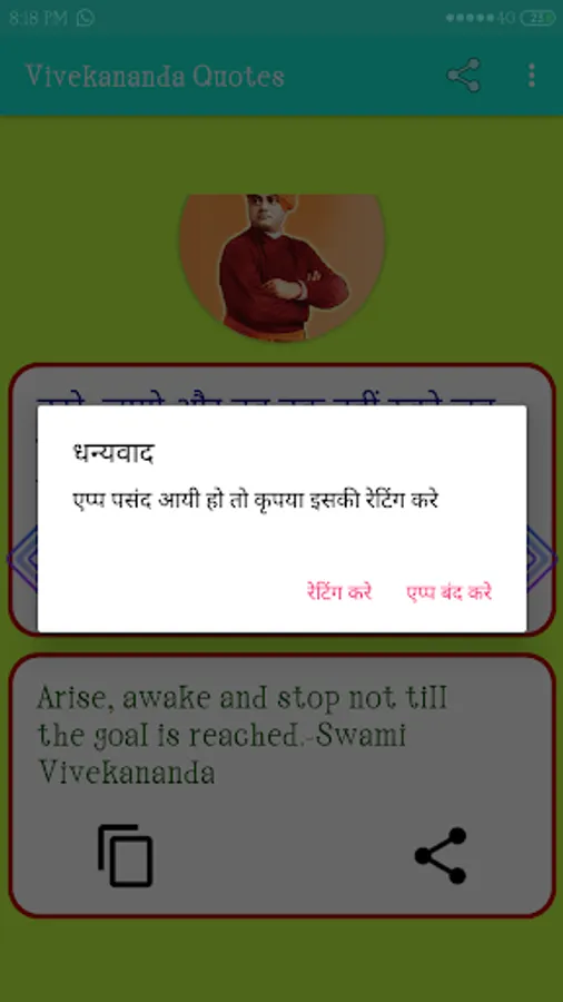 विवेकानंद उद्धरण हिंदी और अंग्रेजी मैं आप का जीवन बदल देगी इस ऐप में स्वामी विवेकानंद के हिंदी उद्धरण हिंदी और अंग्रेजी दोनों भाषाओं में शामिल हैं। स्वामी विवेकानंद के स्वामी विवेकानंद और उनके जीवन शैली की कुछ आश्चर्यजनक तथ्य के बारे में आपको जानकारी होगी। स्वामी विवेकानंद (1863-1902) एक अत्यंत प्रभावशाली और प्रेरित भारतीय ऋषि थे। 1 9वीं शताब्दी के संत रामकृष्ण के मुख्य शिष्य, वे वेदांत और योग के पश्चिमी विश्व को लागू करने में एक प्रमुख व्यक्ति थे और इंटरफेथ जागरूकता बढ़ाने के लिए श्रेय दिया जाता है, हिंदू धर्म को एक प्रमुख विश्व धर्म की स्थिति में लाने के लिए श्रेय दिया जाता है। देर से 1 9वीं शताब्दी