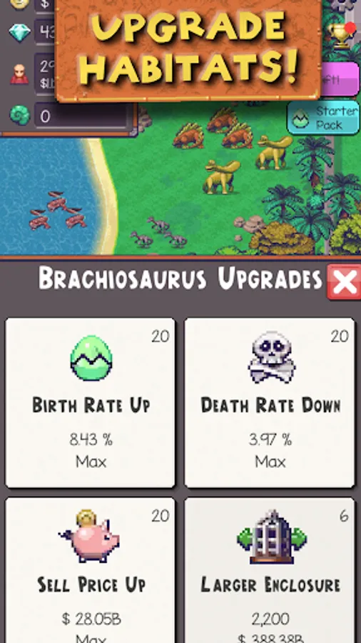 • Manage a zoo and invest in improvements that increase dino birth rates