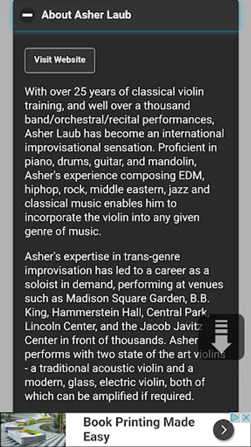 Asher's expertise in trans-genre improvisation has led to a career as a soloist in demand, performing at venues such as Madison Square Garden, B.B. King, Hammerstein Hall, Central Park, Lincoln Center, and the Jacob Javitz Center in front of thousands. Asher performs with two state of the art violins - a traditional acoustic violin and a modern, glass, electric violin, both of which can be amplified if required.