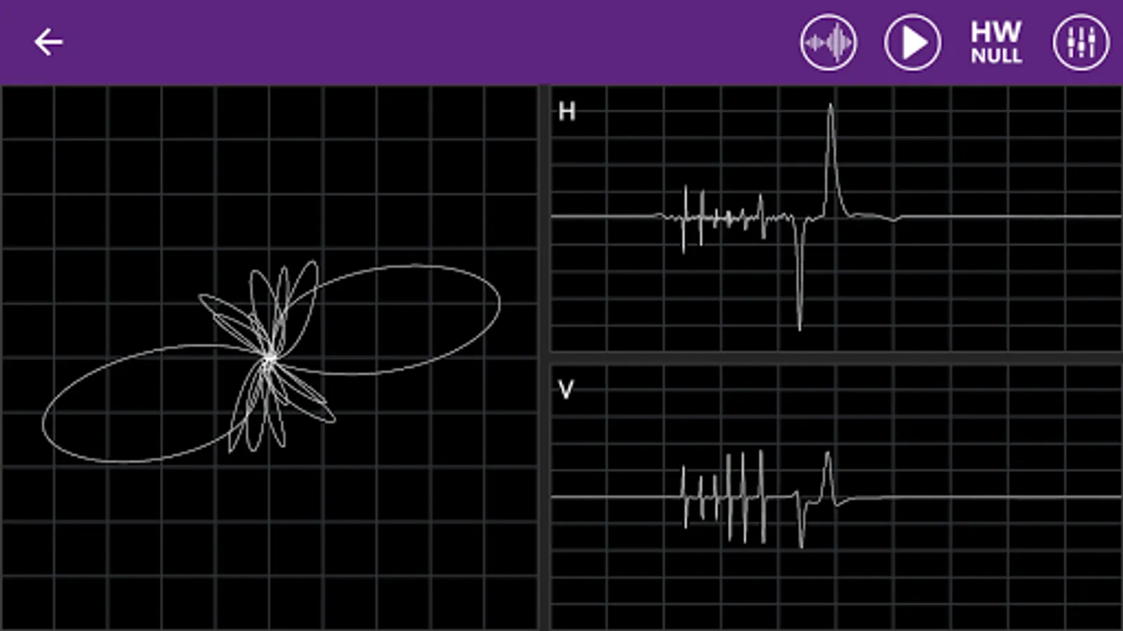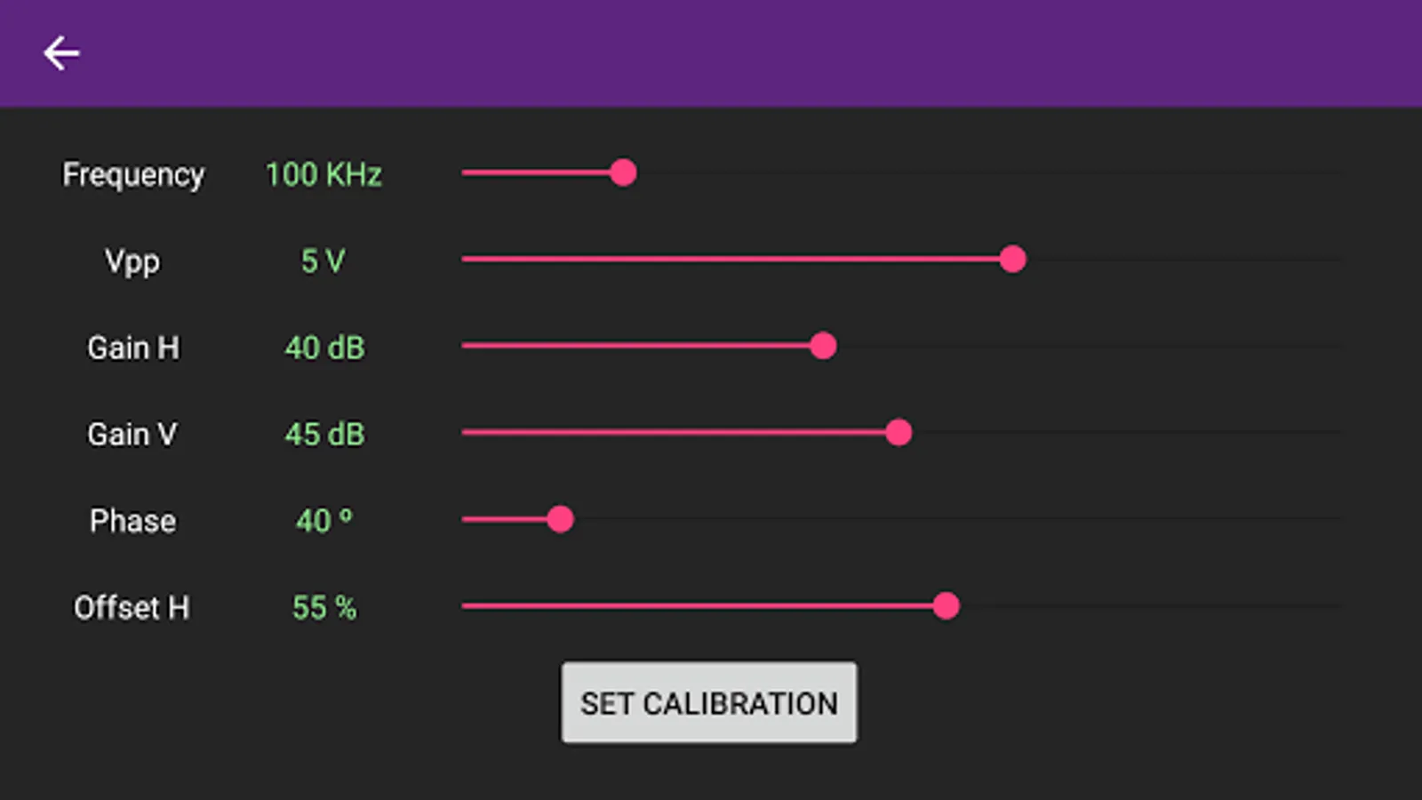 Simulation. This mode is automatically selected when no data acquisition equipment is connected to the mobile. Recorded data from a calibration pattern are presented. You can stop and start the acquisition and change some parameters such as offset, gain and phase of the signal.