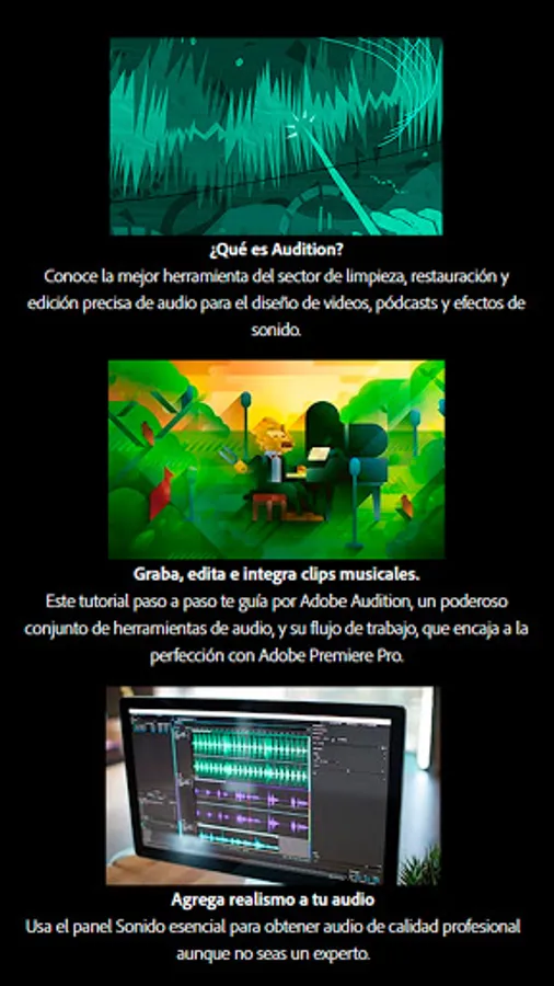 The Adobe Audition Course aims for the student to know, use and become familiar with the application, in order to edit digital audio through multitrack wave mixing processes, both at a destructive and non-destructive level to facilitate design, editing , recording and playing different types of audio.