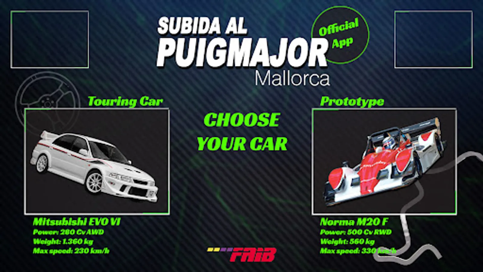 The Pujada of the Puig Major, is a regulated and official test that belongs to the hill climb category. In this event, all kinds of competition vehicles can participate and the drivers are by themselves, fighting against the clock. There are finished vehicles such as the Mitsubishi Evo and prototypes like the Norma N20 F. The winner of this competition is the fastest driver to go through the circuit. In this app, the route is precisely recreated and the user can drive through the circuit with one of these vehicles. Its main goal is to drive through the entire circuit within the smallest amount of time.