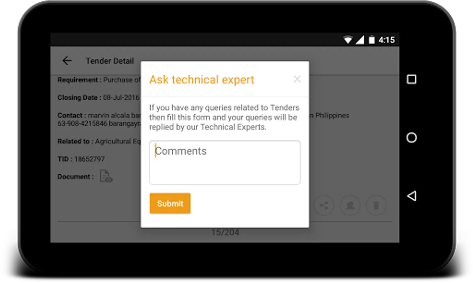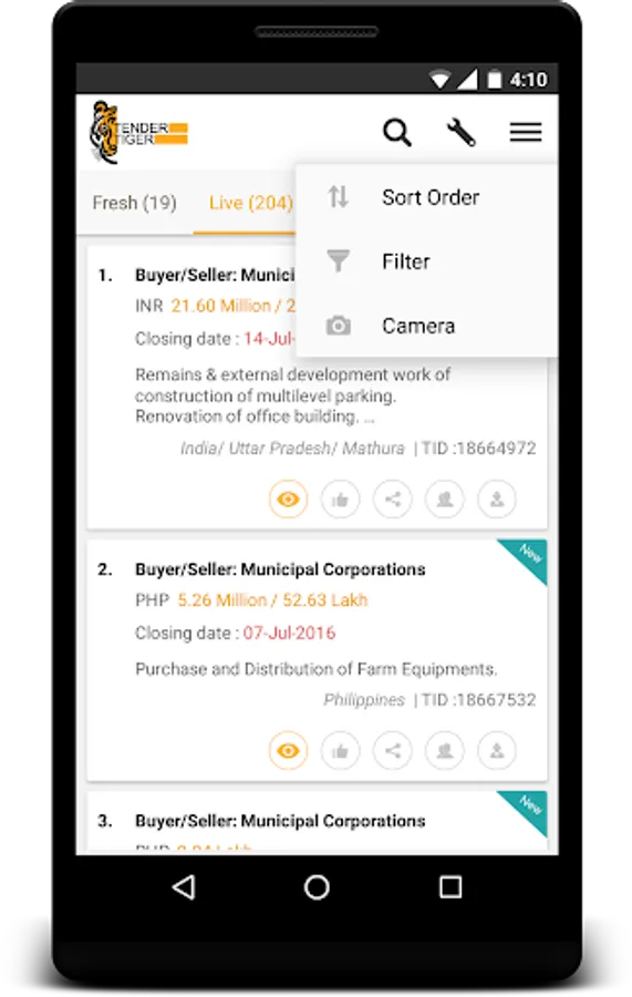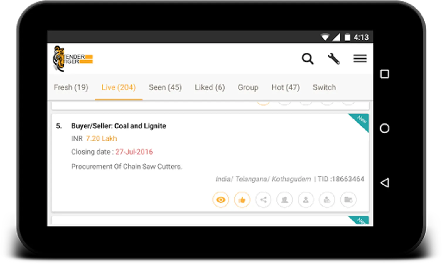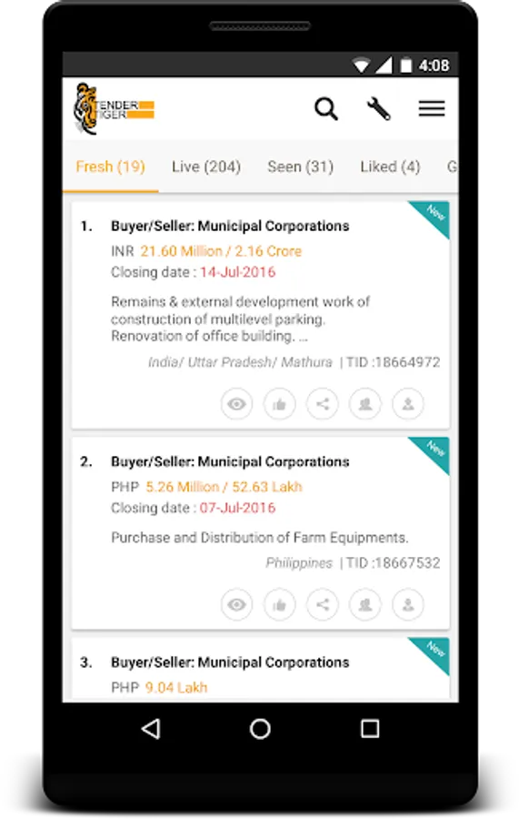 * This App allows you to download/view/share/like all tenders of your choice out of 8 Million new opportunities from Government & Private sector TenderTiger tracks annually. All Tenders of your choice will be saved in your mobile phone such that you can search/view even in offline manner.