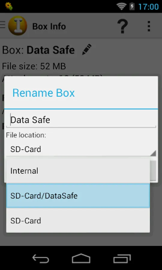 • move your Data Vault file to SD Card (App-Navigation – Box Settings)