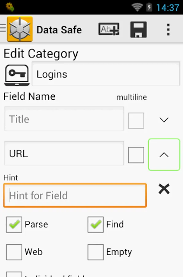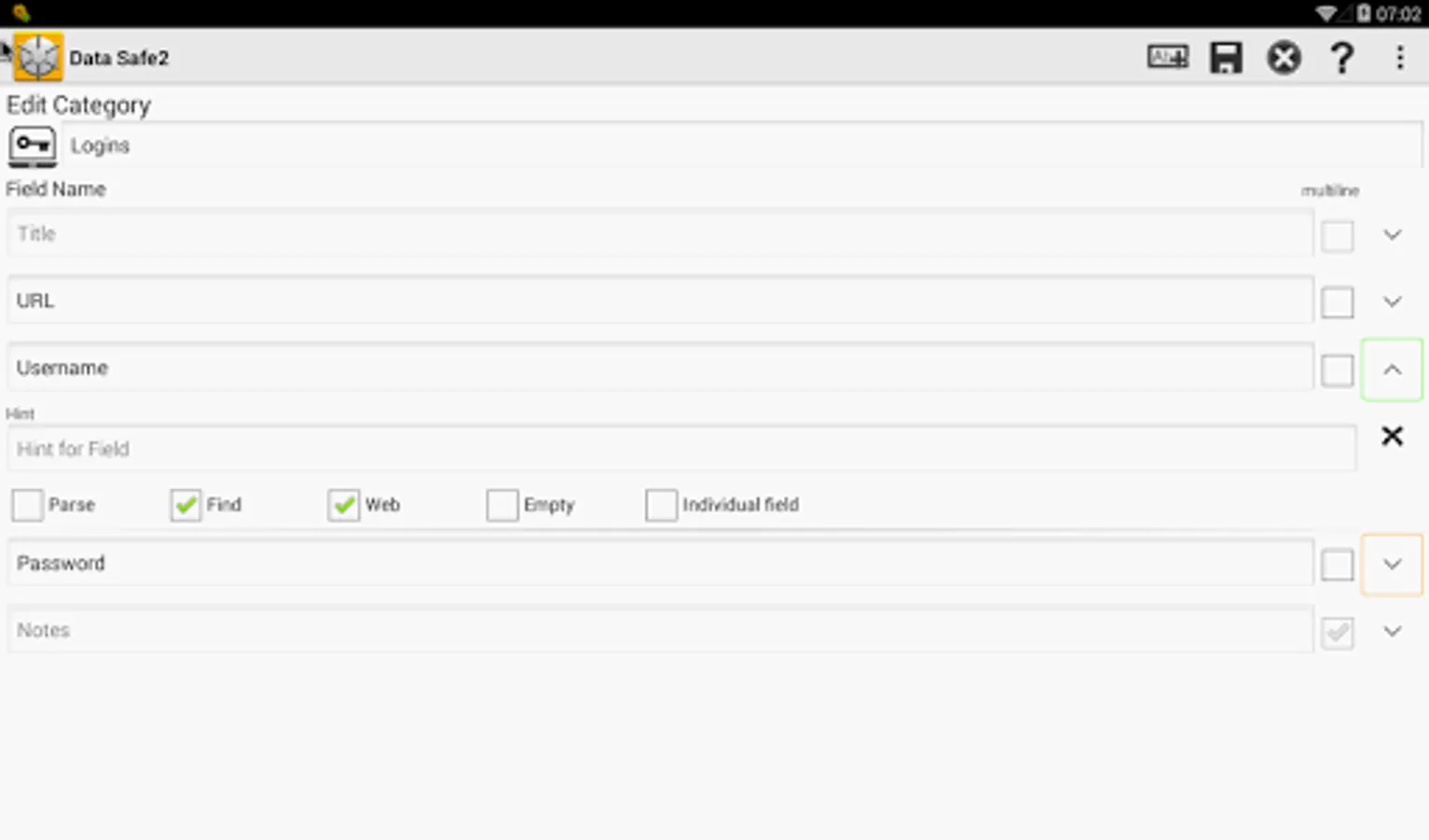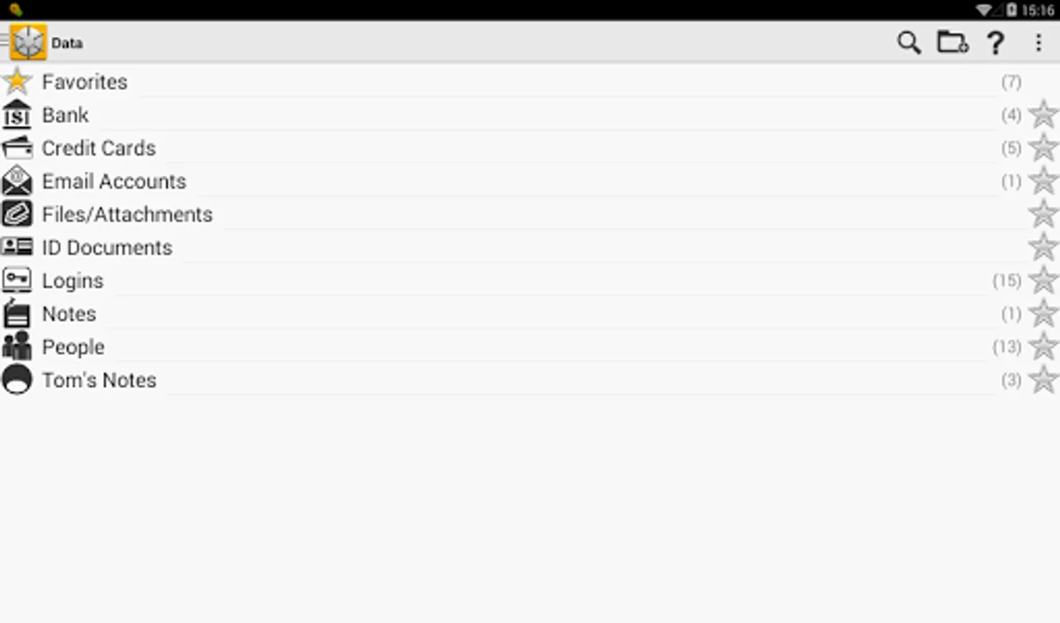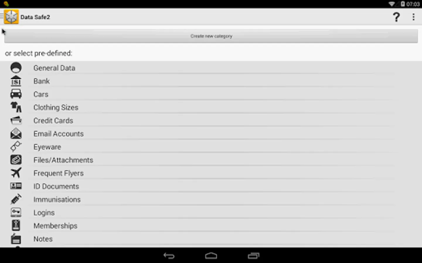 • Categories for logins, passwords, bank data, credit cards, confidential notes and more.