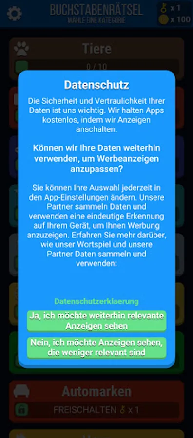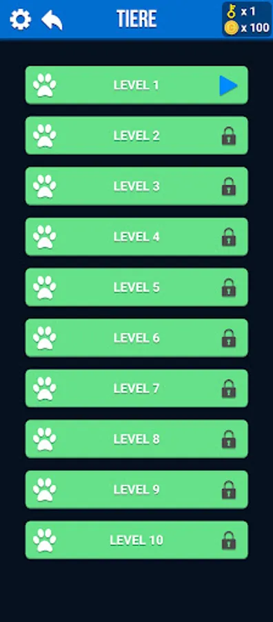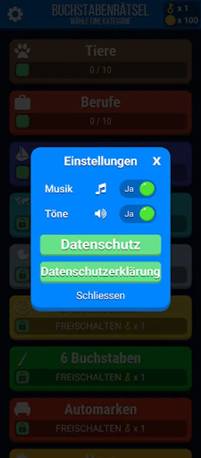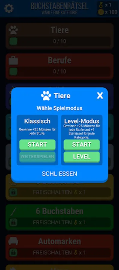 b) Level Mode: Solving pre-set word levels in each category leading to obtaining "keys" to unlock more categories.