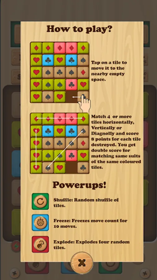 Match suits and solve fun puzzles by collecting Suit Tiles in every level! Begin a journey that combines logic and problem-solving! Play match-3 in a way you have never played before! Slide the tiles to line up Suit Tiles and complete the levels before your Moves run out.