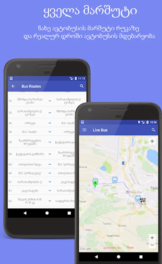 Tbilisi Bus live features includes the following: real time bus table info, bus arrival notifications, all bus routes, real time bus location tracker, mini bus routes, favorites and easy search.