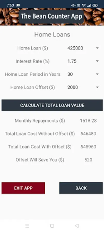 3. A home loan calculator which shows your required repayments, payed amount at full term and the benefits of an offset account.