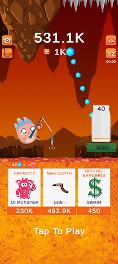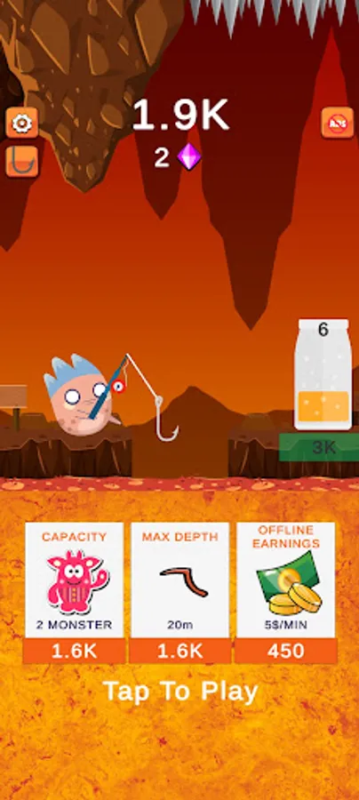 The gameplay is simple and addictive! Tap to start fishing and swipe left and right to catch the Monsters. Once the capacity is reached, the Monsters will be rolled and moved to the jar when jar capacity is reached you are rewarded with gems and give you money. Use the money to upgrade your fishing gear and buy new hooks to get more valuable Monsters to earn more money!