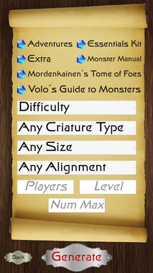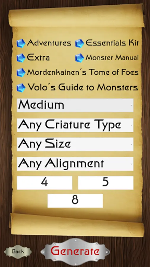 With this tool you can create fights more comfortably and quickly. Includes over 500 creatures from all books and expansions. The results show a possible configuration that can be modified by the user to obtain a better adaptation.