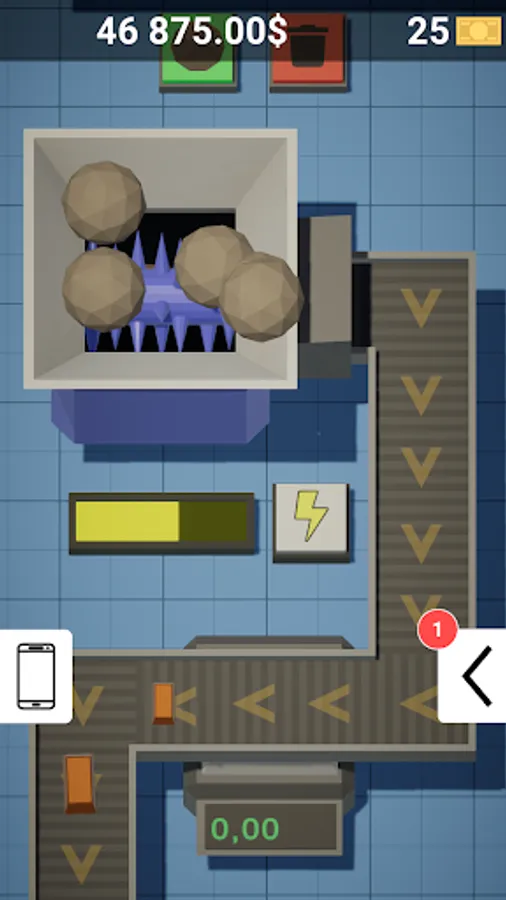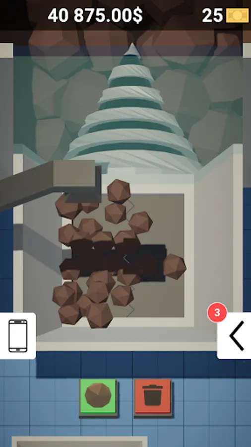 Your empire begins with the extraction of the simplest element - dirt. After that, you can explore what contains in that dirt. For this you have your first machine - Analyzer. It will help you to extract gems from the dirt. After that, the gems is transported by a conveyor to the next machine - a Package Machine, in order to pack the gem and then send this package to the storage. You should know that machines have a charge and you can charge machine. From the storage, you can sell these gems using your smartphone ItemPhone, which is in the game.
