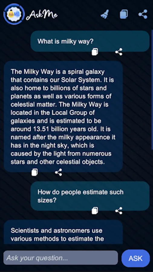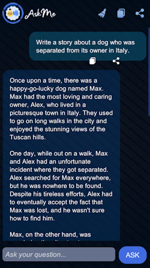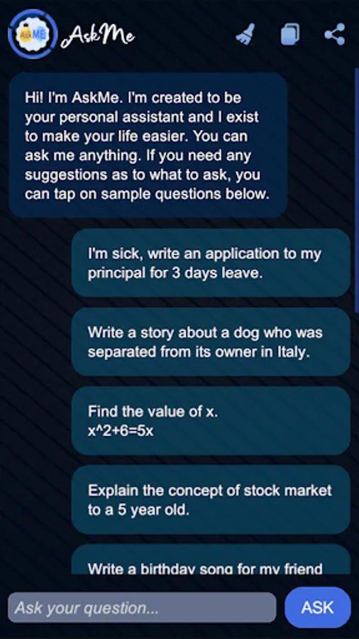 Unleash the power of artificial intelligence as AskMe combines advanced natural language processing with a vast knowledge base to deliver accurate and personalized responses. From trivia and general knowledge to deep dives into specific topics, there's no question too big or small for AskMe to handle.
