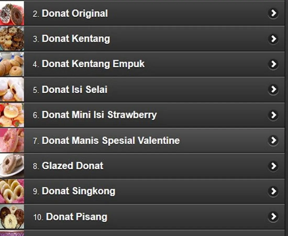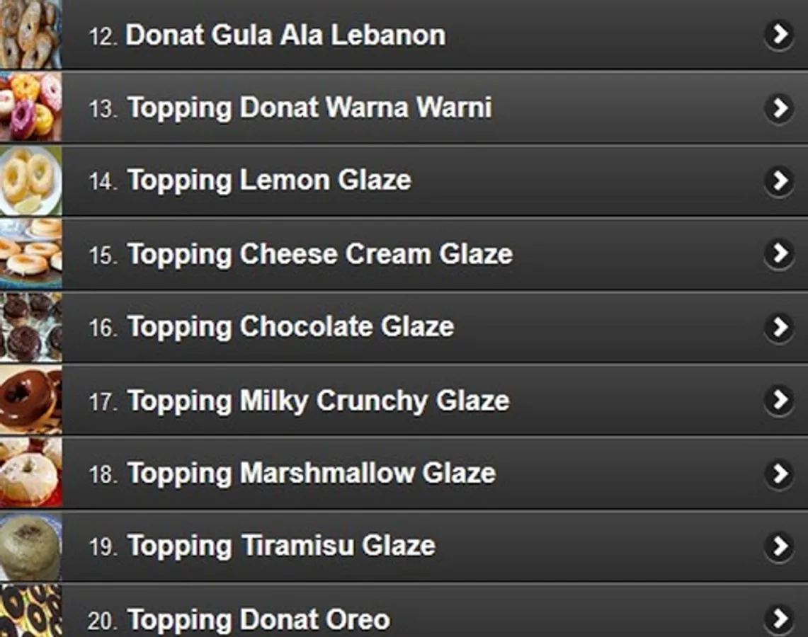 This application contains the latest donut recipes, donuts are now a favorite food for some people and already worldwide. In addition to how to make it easy, donuts can also be decorated according to the wishes of the maker to look beautiful and attractive, this application is also equipped with various donut toppings.