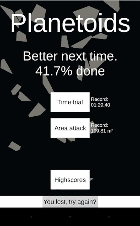 Time trail: Try to destroy all 10 planetoids as fast as possible.