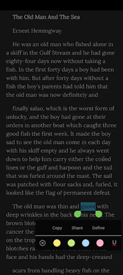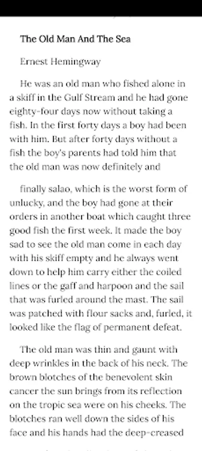 Here Hemingway recasts, in strikingly contemporary style, the classic theme of courage in the face of defeat, of personal triumph won from loss. Written in 1952, this hugely successful novella confirmed his power and presence in the literary world and played a large part in his winning the 1954 Nobel Prize for Literature.