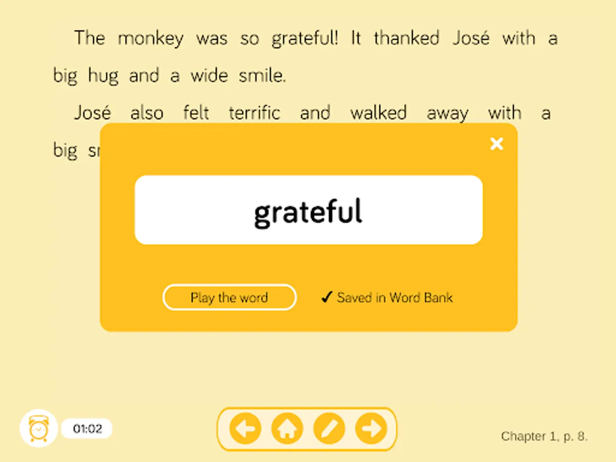 Features include the ability to tap a word to hear its pronunciation and a Word Bank where challenging words can be saved for future practice. Readers can also set reminders for regular reading times and reading difficulty levels. There is even an "Analytics" option that will email readers a custom spreadsheet summarizing results metrics such as ‘number of words read’ and ‘number of pages per minute’.