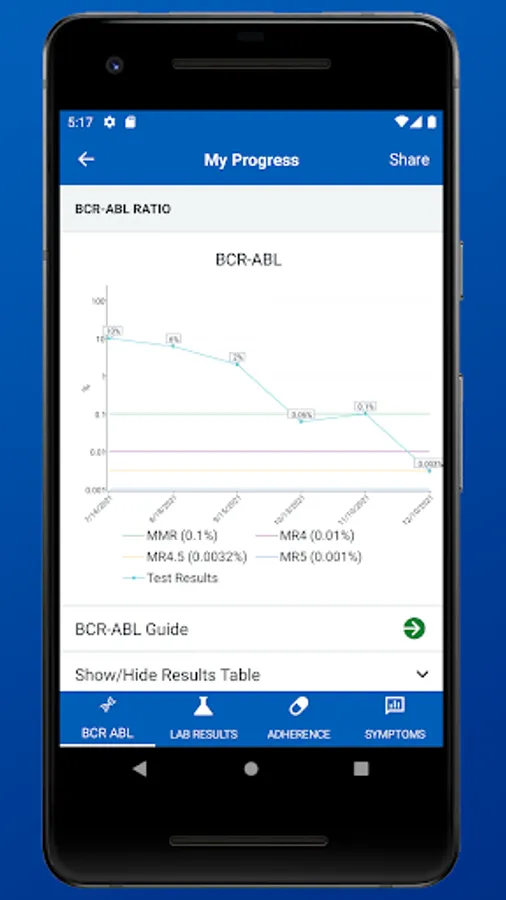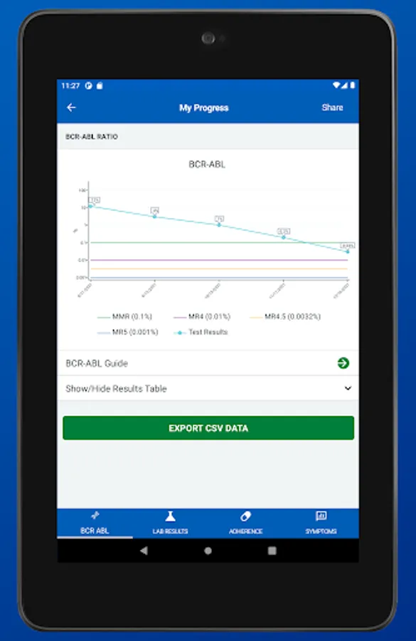 - The ability to enter key lab test results. Patients or their family member/ carer can record important blood test results such as BCR-ABL PCR, full blood count, kidney function and liver function. Patients can then keep track of their results over time using the tables and graphs in the My Progress section.