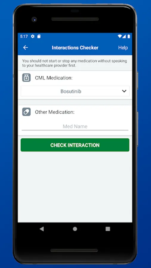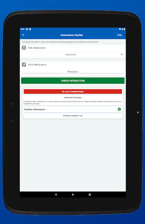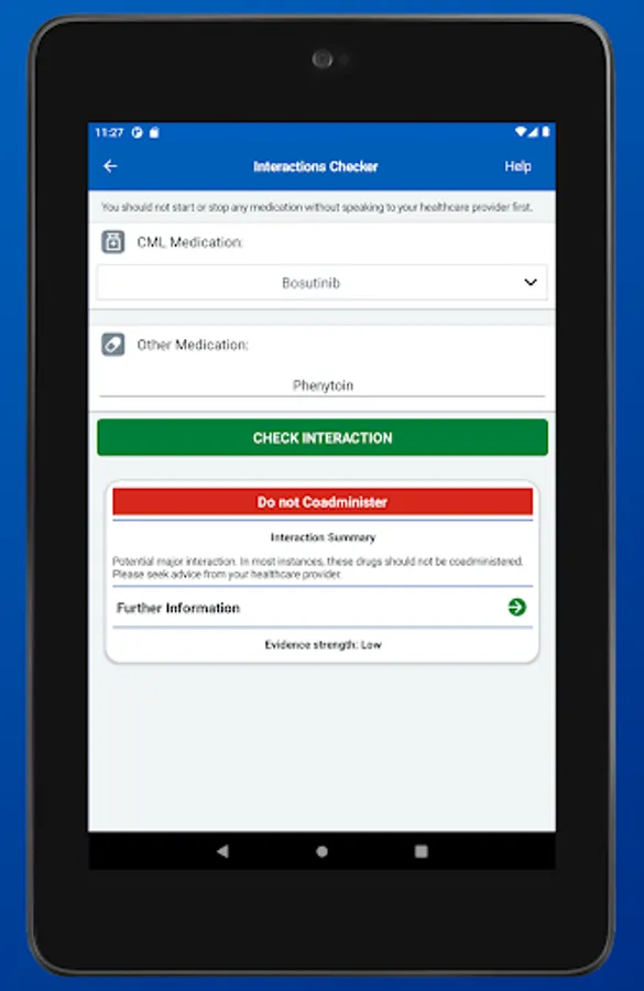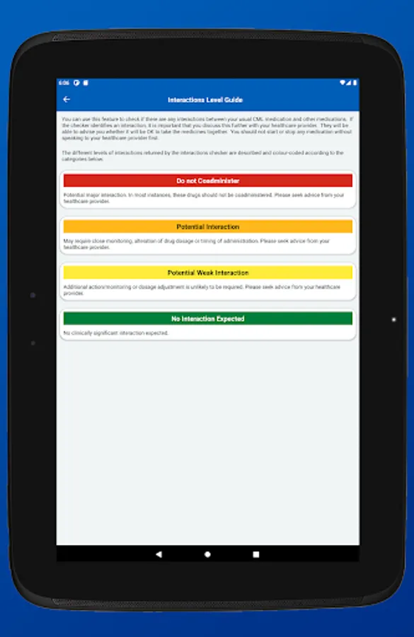 - A drug interaction checker. Patients or their family member/ carer can check if there are any interactions between their CML medication and other medications. The app uses a traffic light system to tell the user whether there is likely to be an interaction between any two medications and how significant any interaction is likely to be.