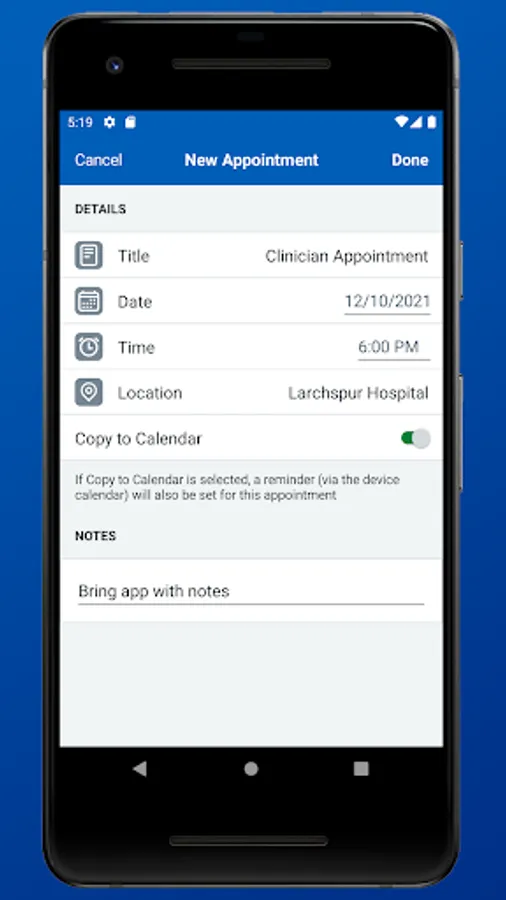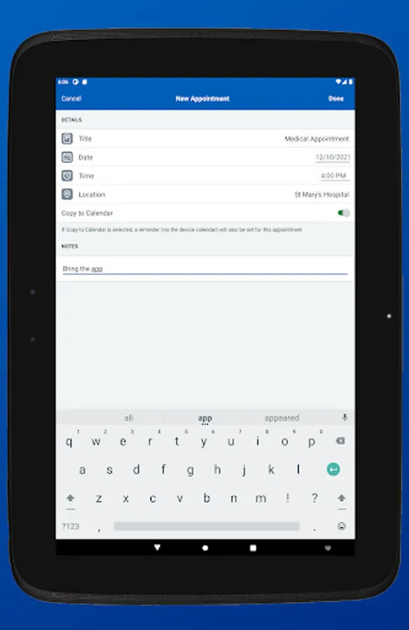 - An appointment diary. Patients or their family member/ carer can keep track of all CML-related appointments. It also has a notes function so that patients can record any questions or topics that they might want to talk about to their health care provider.