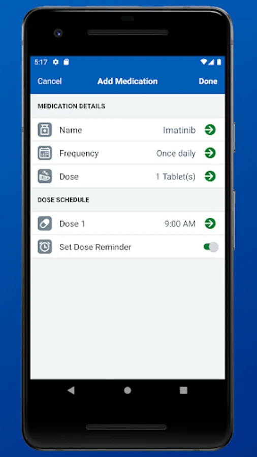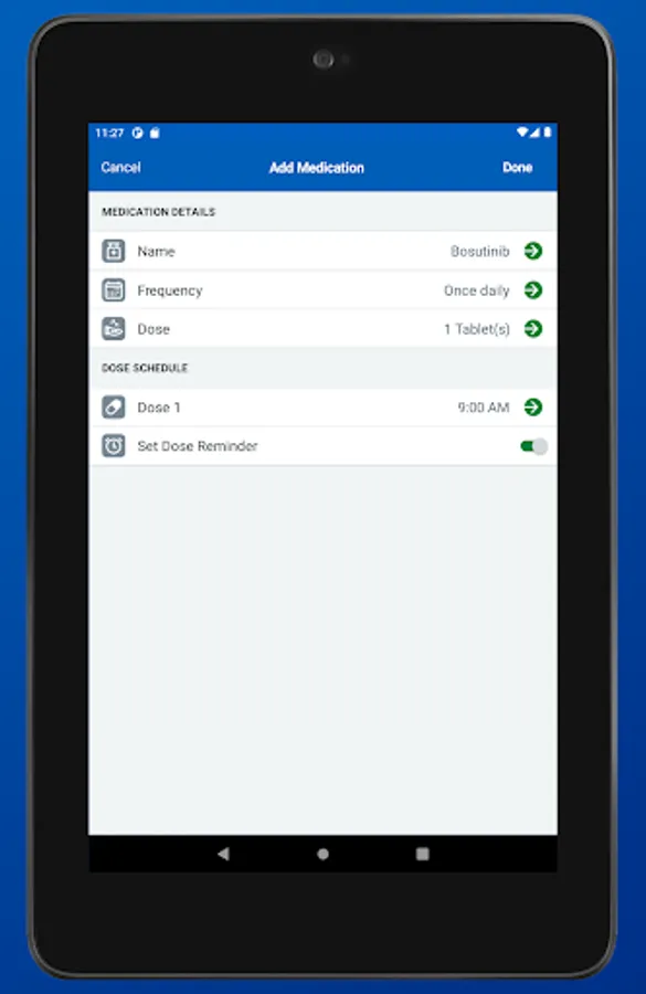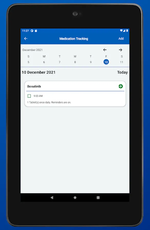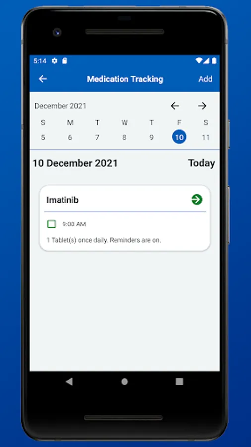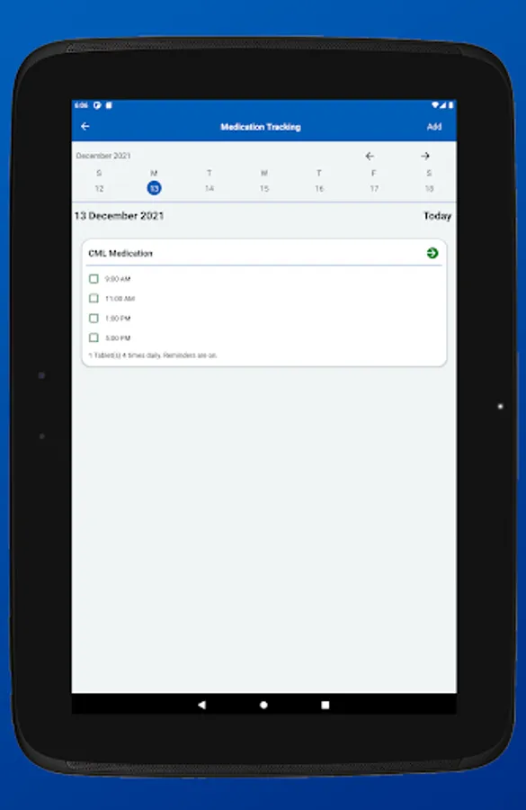 - A medication reminder tool. Patients or their family member/ carer can set a daily reminder to help them remember to take the CML medication (and any other medication that they might take regularly). Patients can also record every time they take a dose of their medication to check how good their adherence is using the My Progress function, and generate a graph to share with their healthcare provider.