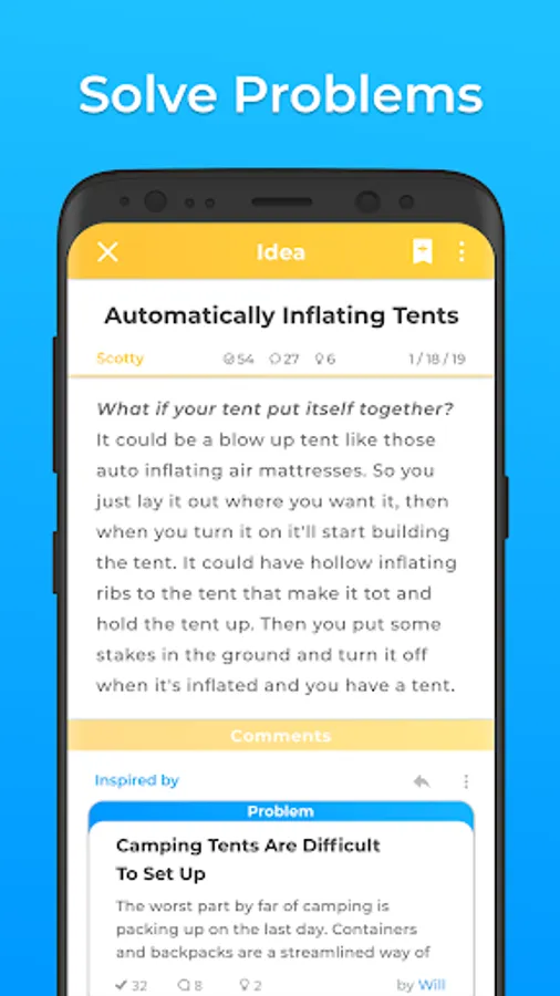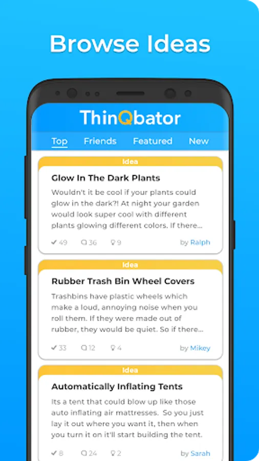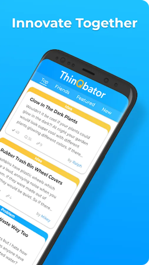 ThinQbator is made for idea people with new invention ideas who want to start inventing new things but dont know how to. This online brainstorming platform gives our users the opportunity to innovate and brainstorm online. If you like developing and collaborating on new product ideas and inventing things, ThinQbator is the idea app for you. Create a mind map by linking ideas to problems that they solve and link similar ideas together. You can also post your ideas privately and use this app as your own idea journal. ThinQbator stands for thinking incubator, which means that we aim to foster new ideas and help them to become a reality. So share your ideas! Help us innovate, and invent a better world. We took an open innovation approach to brainstorming and ideation because we understand that in order for great ideas to happen, you need a creative community of people's different perspectives and opinions to refine an idea and make it amazing.