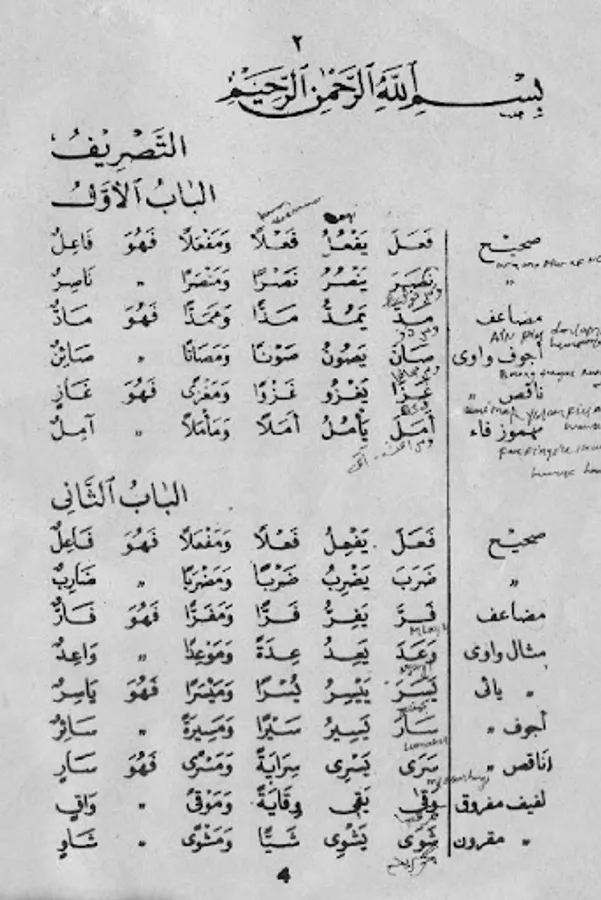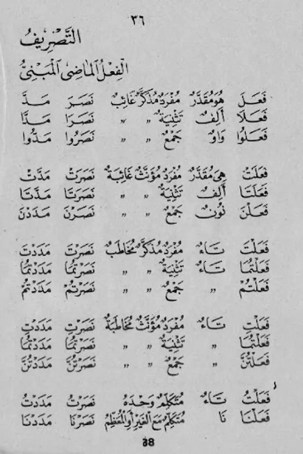 In the pesantren world, the six chapters are "usually" condensed into this verse: Fathu Dhamin, Fathu Kasrin, Fathatani, Kasru Fathin, Dhammu Dhammin, Kasratani. These six chapters summarize the types of vowel 'ain fiil in each of their Madhi and Mudhari forms.