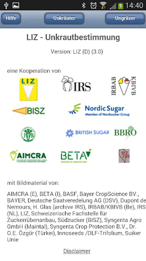 The free app LIZ-weed-determination is used for rapid and precise determination of 137 different weeds and grass weeds in sugar beet 35 different. Supported by many pictographs (pictures) can be carried out based on the determination of any number of plant organs. The individual weeds and grass weeds are described in detail (germination, leaves, stems, flower, etc.) and shown in various stages of development and with different details based on multiple images. The determination of the weeds and grass weeds occurs without an internet connection, only to display the photos need an online connection. This app is a joint development by LIZ, BISZ, IRS, IRBAB / KBIVB, ITB, Nordic Sugar, British Sugar, AIMCRA, BETA and SFZ / CBS.
