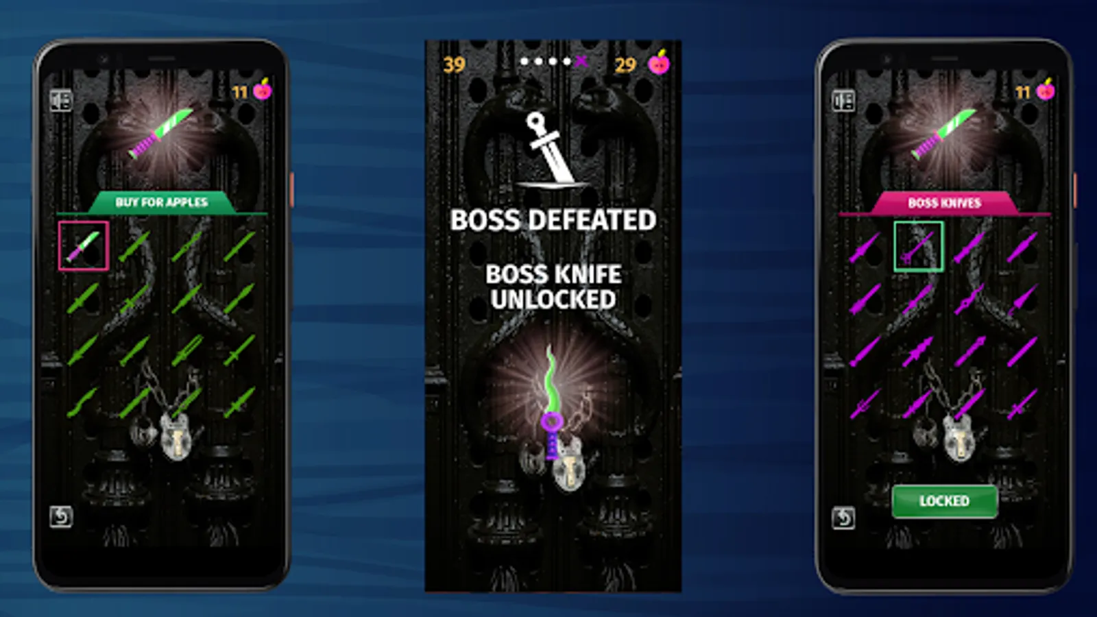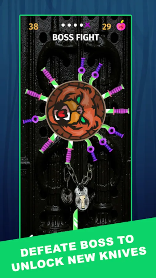The knife Shooter game is very simple and cool, Throw all knives into the logs to unlock the new stage. If you successfully complete 4 stages, you will find the 1st Boss in the 5th stage. Debe the throw master. Slash the apples and unlock new knives. Each fifth stage is protected by a boss. Beat the boss to get exclusive knives!