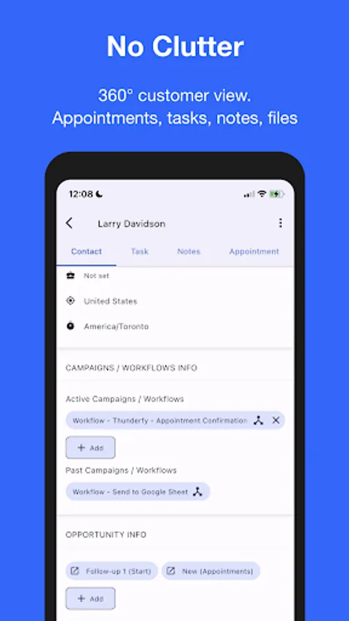 360° customer view. Lead scoring, appointments, tasks, notes, files.