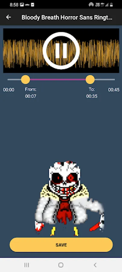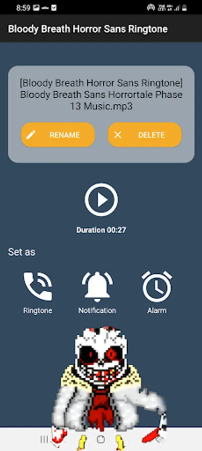 Hi .... Last Bloody Breath Sans Horrortale Fans .... Now You can Play Horrortale Music and You can set it as for ringtone and more... This app by fans for fans of Horror Sans Last Breath Undertale Megalovania Music ...