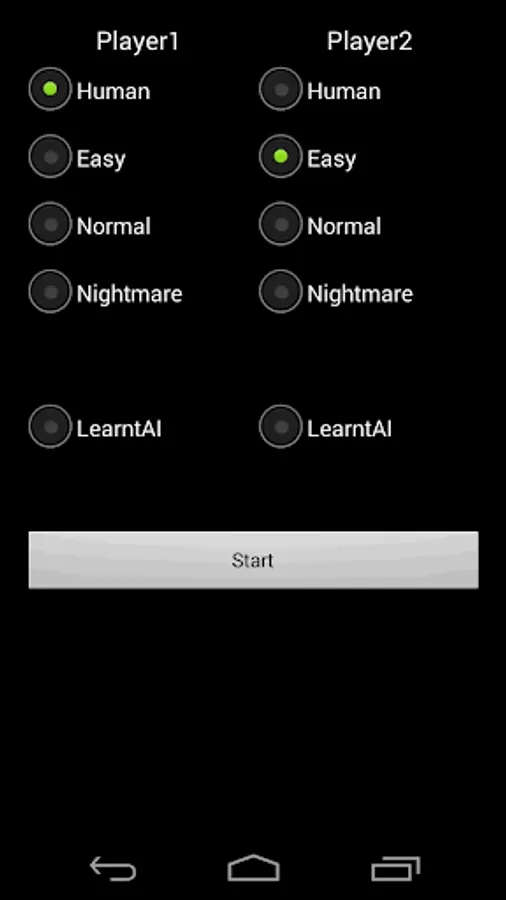 The Artificial intelligence in the game applies Minimax search with Alpha-beta pruning. The AI evaluating function is using linear weighted sum of features, the weights are hard coded for this part. The "Easy" difficulty is search 1 depth in Minimax search, "Normal" one is 2 depths, and "Nightmare" one is 3 depths.