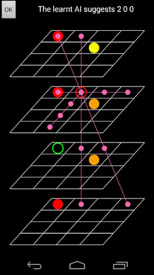 The Machine learning part in the game is shown as the "green ring hint" in the "Human" mode and also the "LearntAI" mode. The "green ring hint" is the best move given by self-learning AI (1 depth of Minimax), you can follow the suggestion or make your own decision. The self-learning AI is pretty stupid at the beginning, but after any game was played (human vs computer or computer vs computer), this AI will automatically learn this game history, all the weights will be updated by Least mean square rule. So self-learning AI will be more and more intelligent after more games were played, you can feel the "green ring hint" will make much more sense after dozens of games. And if you kept on making "LearntAI" (updated after every game) play with "Easy" (hard coded), the "LearntAI" would always lose at the beginning, but finally have much more probability to win. The Artificial neural network hypothesis was finished but haven't enabled in the game, because it need more updates than linear hypothesis (slow), and it would be supported later when I found a better game mode to make it improve user experience.