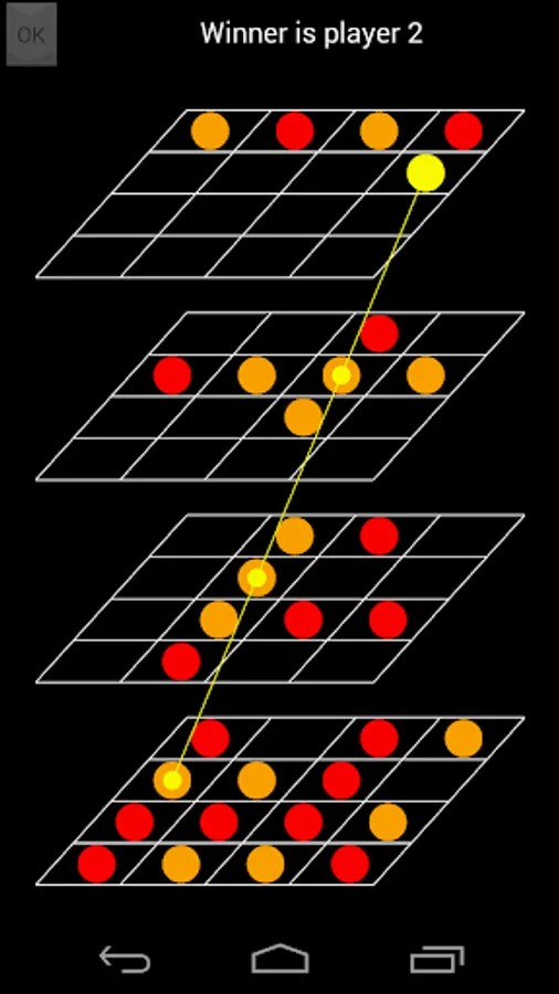 In the board, there are 4 levels, 4 rows, and 4 columns, you will win if there are 4 pieces of yours connected in any horizontal, vertical, or diagonal line. Notice that the winning line includes the line cross different level, that means even the vertical line going from top level to bottom level is regarded as a wining line. All possible winning routes for each spot are shown as imagining line which will be displayed after touching certain spot.