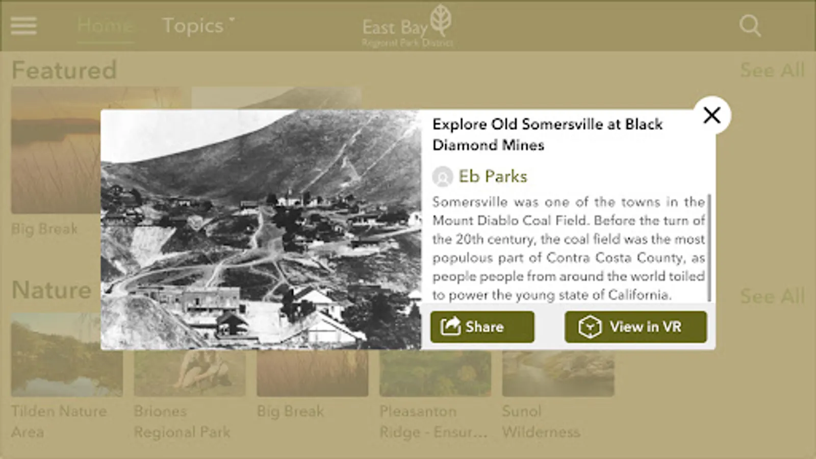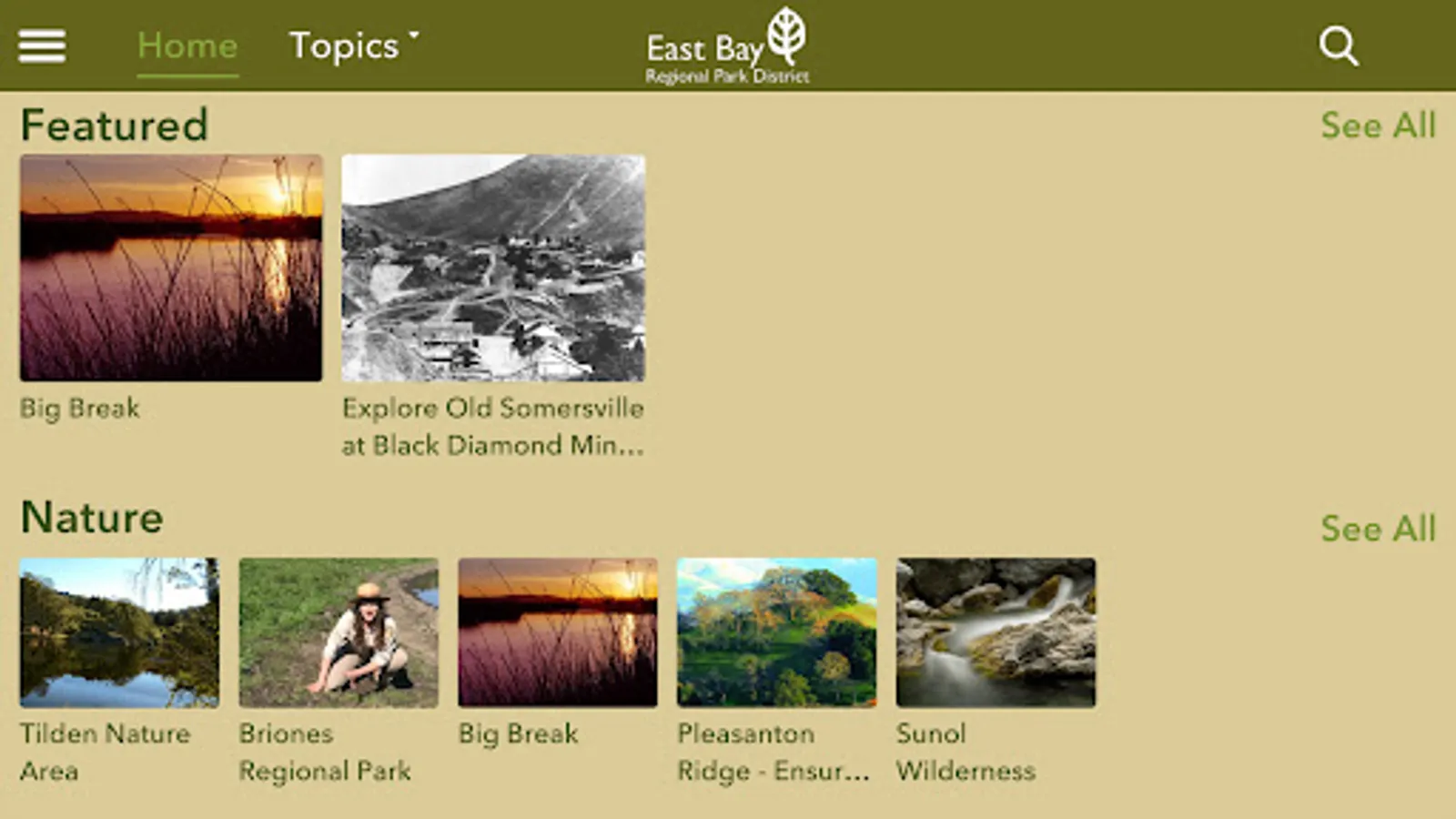 The East Bay Regional Park District is a system of beautiful parklands in Alameda and Contra Costa counties to the east of San Francisco. The system comprises 73 parks spanning across 125,000 acres; 1,250 miles of trails; 55 miles of shoreline. We manage and preserve natural and cultural resources for all to enjoy and protect. The regional parks are ideal for healthful recreation and environmental education. Using the Xplore East Bay Parks app, you can discover hidden histories and natural wonders in the parks you know and love. Using augmented reality, we are bringing the wonder and excitment of exploring the natural world to your personal device creating a park excperince accesible to all! Learn about your own backyard and adventure into new places with the numerous Xplore East Bay Parks app experiences. Enjoy YOUR parks!