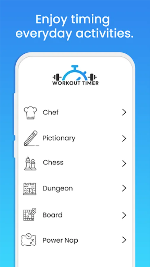 ⏳ Set timers for various activities such as: Tabata, Interval, HIIT, Amrap, Boxing, Presentation, Meditation, Board, Power Nap and many other