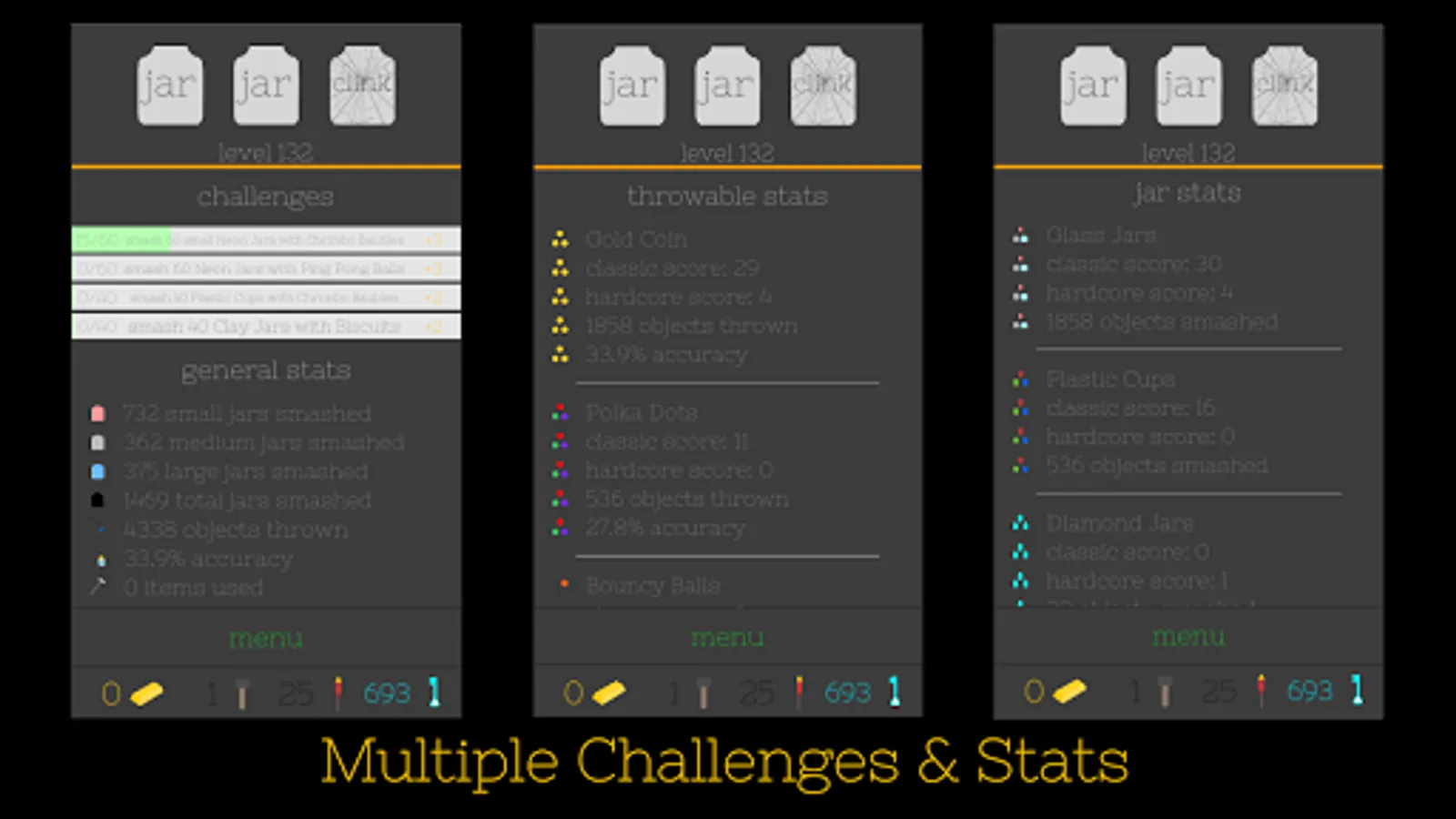 Smash untold amounts of jars with a range of throwable items! Unlock different modes, themes, jars, items and throwables by completing challenges. Try to beat your high score with a different Jar + throwable combo - some are easier than others. Designed to be simple, easy, relaxing and fun, Enjoy!