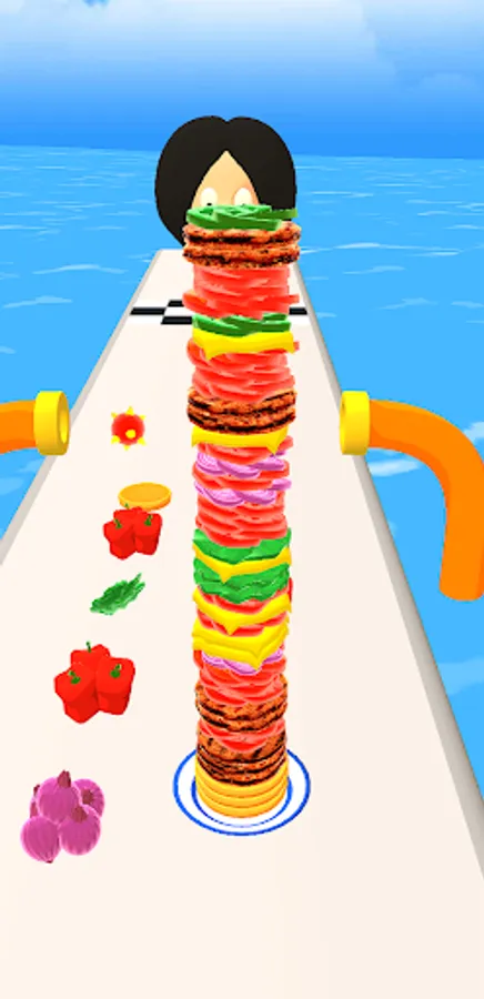 make the tallest burger tower by collecting sandwich items along the way and take more money from her.