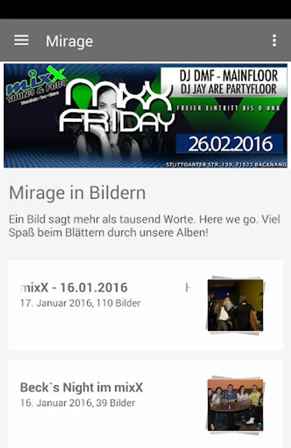 Mirage is now available on your smartphone! Anywhere in the world via news, photos and events coming know about. Stay up to date with push notifications. Contact the back there is also the simple touch of a button. This app connects people.