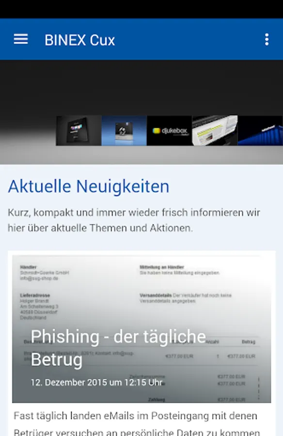 Now there's BINEX as the official app for smartphone! All news, photos, events and dates as land directly in your pocket. Whenever there is something new about computers, IT, IT, telecommunications, Microsoft, say Sophos, AVM and Tobit there's ringing on your phone. And because a smartphone is simply a phone, a button can be equal to make a connection.
