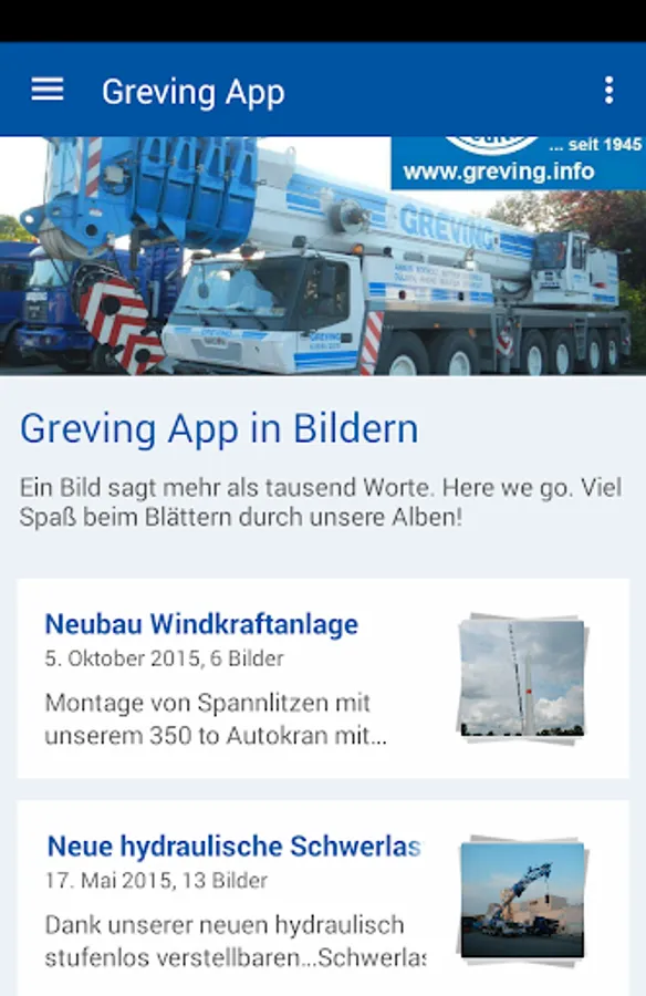 Now there Greving mobile crane rental as official app for Smartphone's! All news, photos, events and dates land so directly in your pocket. Whenever there is something new on your phone's ringing. And because a smartphone is just a phone, can be a button equal to make a connection. The Greving App always provides a direct line.
