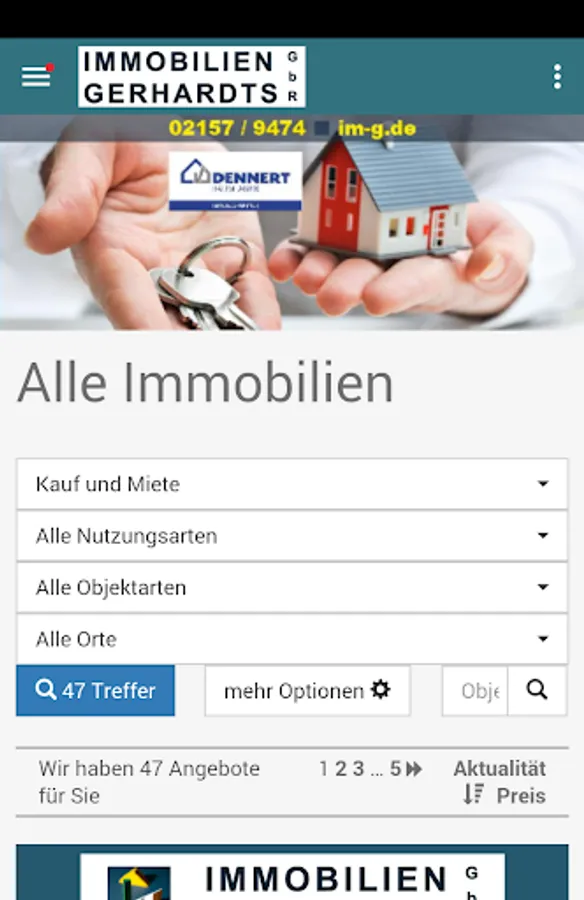 Now there's the latest real estate offers real estate Gerhardt GbR from Brüggen in the Viersen as the official app for Smartphone's! All new rental and purchase offers, photos, events and information on energy advice and appropriate financial assistance to land right in your pocket. Whenever we publish a new offer from Bruggen, Bracht, Nettetal, Schwalmtal Niederkruechten and environment, it notifies you of your smartphone immediately. And because a smartphone is simply a phone, a button can be equal to make a connection to us. The IM App G.de always provides a direct line to us.