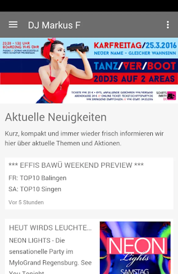 Now there's DJ Mark F's as the official app for smartphone! All news, photos, events and dates as land directly in your pocket. Whenever there is something new on your phone's ringing. And because a smartphone is simply a phone, a button can be equal to make a connection. The DJ Markus F-app always provides a direct line.