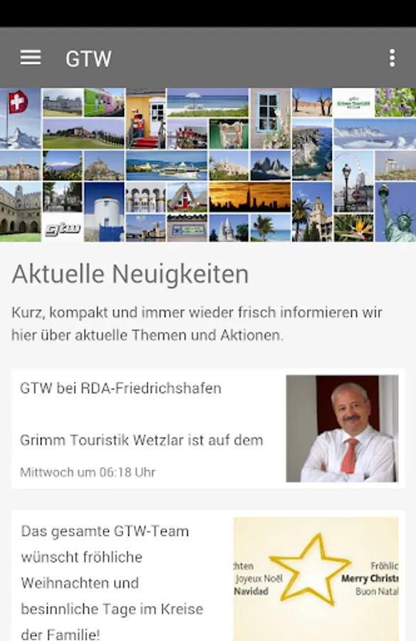 GTW - Grimm Touristik Wetzlar now available as free app for your smartphone or tablet! All news, new catalogs, special trip highlights or important dates, with our app you are always red-hot! Contact us through our app at any time, ask your travel request to immediately and without obligation, via email or phone. All with just one click!