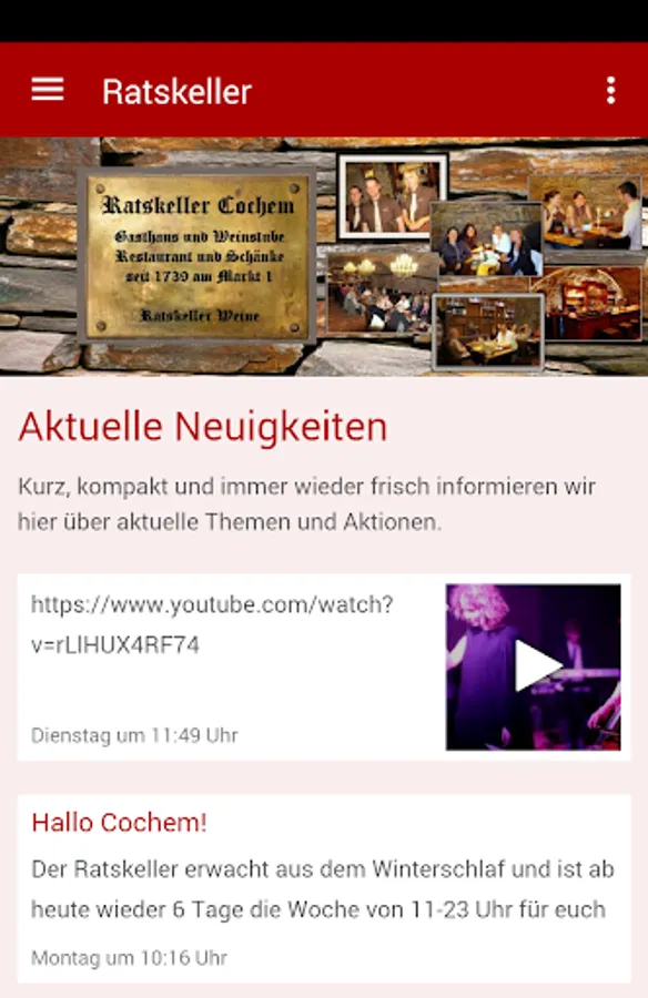 Now there Ratskeller as a mobile app! All news, photos, events and dates always there. Thanks to push notifications any news comes immediately on Smartphone. Contact back, there are also, simply by pressing a button. This app connects people.