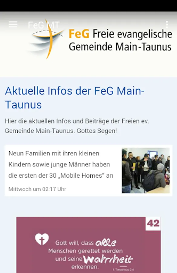The FeG Main-Taunus is a Christian free church that wishes to be present for people in the Main-Taunus-Kreis. We want to close bring the unconditional love of God in Jesus Christ our environment and make tangible his uplifting grace. We belong to the Confederation of Free Evangelical Churches (Alliance), based in Witten (www.feg.de).