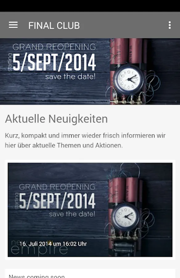 Now there is a FINAL CLUB's official app for smartphone! All news, photos, events and dates as land directly in your pocket. Whenever there is something new on your phone's ringing. And because a smartphone is simply a phone, a button can be equal to make a connection. The FINAL CLUB App always provides a direct line.