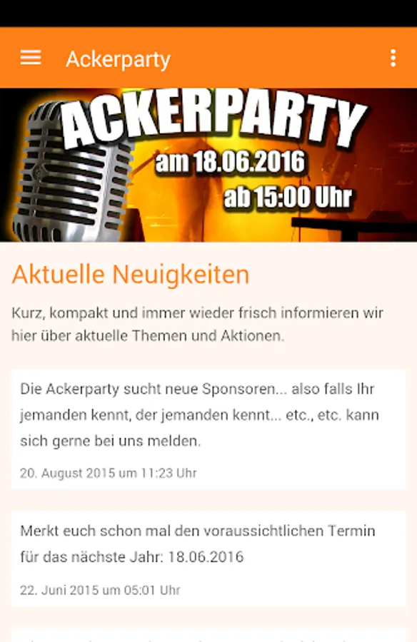 Acker Party, the open-air rock event with newcomer bands from Cologne, Germany. Free admission! Cheap food and drinks! Foosball table! Bull Riding! Jousting! And now as a smartphone app. All news, photos and events as land directly on your smartphone. And because a smartphone is just a phone, can be a button equal to establish a connection. The FIELD PARTY app always provides a direct line.